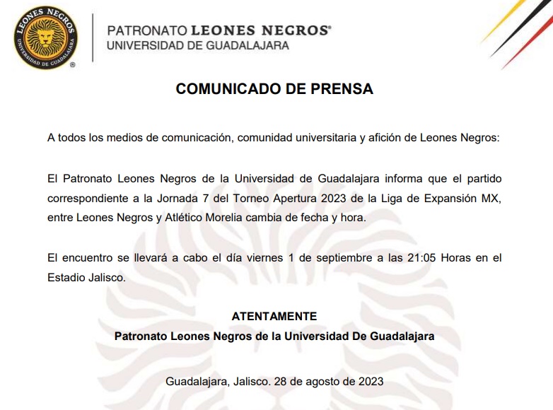 GUADALAJARA, Jalisco (28/Agosto/2023).- Derivado de varios ajustes en los calendarios, el Patronato Leones Negros de la Universidad de Guadalajara informa que el partido correspondiente a la Jornada 7 del Torneo Apertura 2023 de la Liga de Expansión MX, entre Leones Negros y Atlético Morelia cambia de sede y hora.