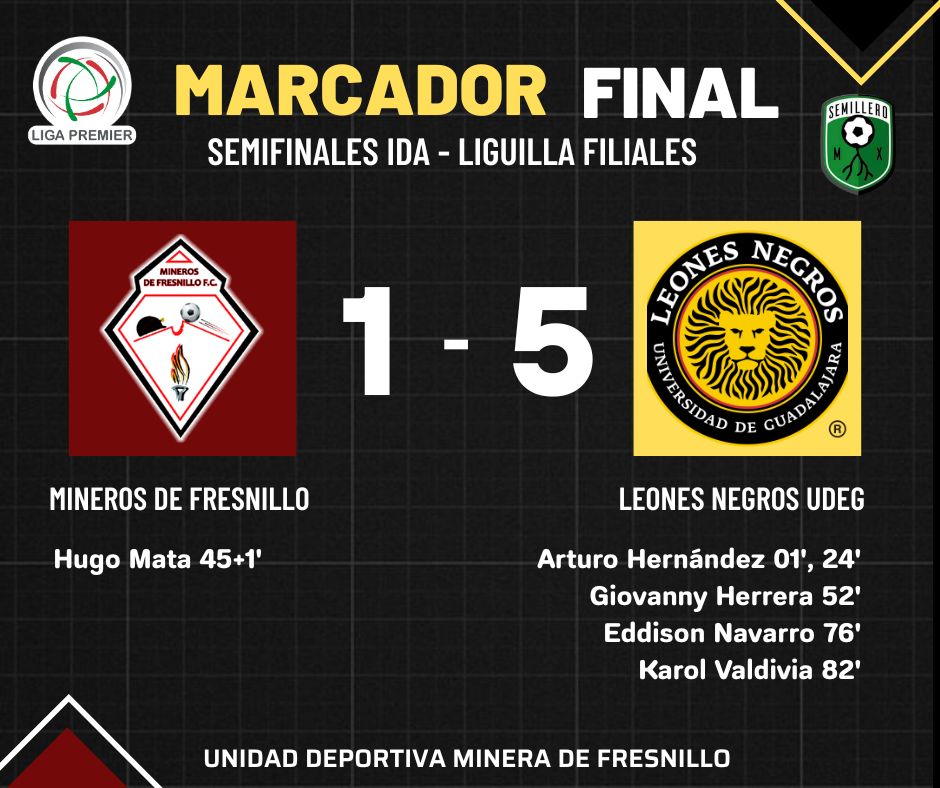 FRESNILLO, Zacatecas (19/Abril/2025).- El equipo Premier de la Universidad de Guadalajara consiguió una cómoda ventaja en su visita a la Unidad Deportiva Minera, donde venció a 1-5 a los Mineros de Fresnillo en el partido de ida de la Semifinal de Filiales.